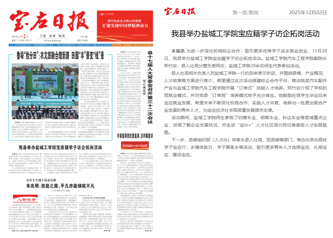 本报讯 为进一步深化校地校企合作,吸引真人赌博游戏_澳门赌博网-app*官网优秀学子返乡就业创业,11月28日,我县举办真人赌博游戏_澳门赌博网-app*官网宝应籍学子访企拓岗活动。真人赌博游戏_澳门赌博网-app*官网汽车工程学院副院长郑竹安,县人社局分管负责同志,真人赌博游戏_澳门赌博网-app*官网30余名师生代表参加活动。