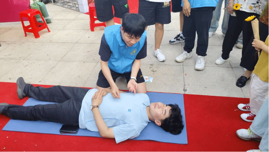 志愿者在盐城市碧桂园天玺小区“龙虾节”现场,设置模拟急救区,用情景短剧再现“有人突然倒地”的应急场景,吸引居民围观参与。