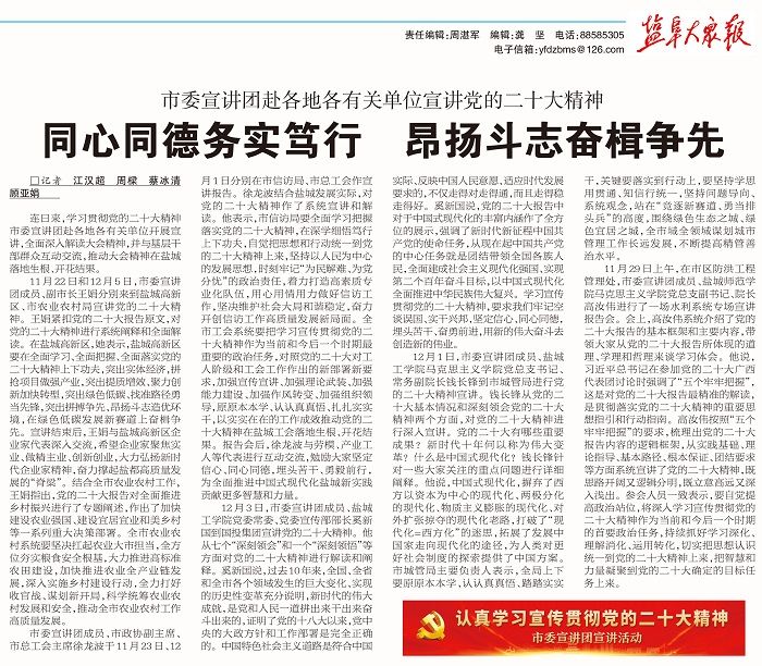 12月3日,市委宣讲团成员、真人赌博游戏_澳门赌博网-app*官网党委常委、党委宣传部部长奚新国到国投集团宣讲党的二十大精神。他从七个“深刻领会”和一个“深刻领悟”等方面对党的二十大精神进行解读和阐释。奚新国说,过去10年来,全国、全省和全市各个领域发生的巨大变化、实现的历史性变革充分说明,新时代的伟大成就,是党和人民一道拼出来干出来奋斗出来的,证明了党的十八大以来,党中央的大政方针和工作部署是完全正确的。中国特色社会主义道路是符合中国实际、反映中国人民意愿、适应时代发展要求的,不仅走得对走得通,而且走得稳走得好。奚新国说,党的二十大报告中对于中国式现代化的丰富内涵作了全方位的展示,强调了新时代新征程中国共产党的使命任务,从现在起中国共产党的中心任务就是团结带领全国各族人民全面建成社会主义现代化强国、实现第二个百年奋斗目标,以中国式现代化全面推进中华民族伟大复兴。学习宣传贯彻党的二十大精神,要求我们牢记空谈误国、实干兴邦,坚定信心、同心同德,埋头苦干、奋勇前进,用新的伟大奋斗去创造新的伟业。