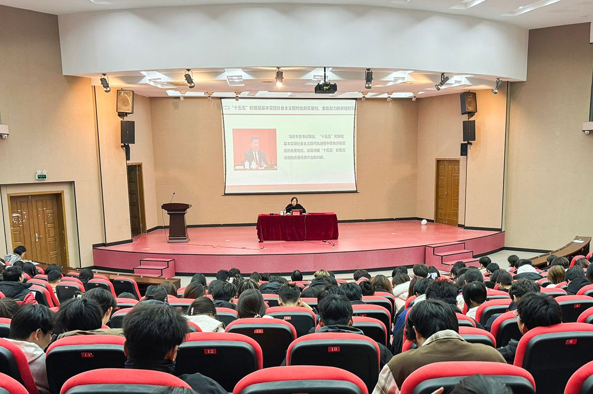 胡凌霞面向各二级学院团干部、青马班学员、学生会骨干及学生代表等进行宣讲。她围绕全会重大意义、“十五五”时期在社会主义现代化建设中的重要地位、经济社会发展指导方针与主要目标、战略任务与重大举措、坚持和加强党的全面领导等方面,对全会精神进行全方位阐释与深层次解读。针对青年学生群体,她强调,要深化认识,做全会精神的“领悟者”;要积极发声,做全会精神的“传播者”;要投身实践,做全会精神的“践行者”。她勉励广大青年学生将个人成长融入国家发展蓝图,在科技创新、社会服务等领域挺膺担当,为强国建设、民族复兴伟业贡献青春力量和智慧。