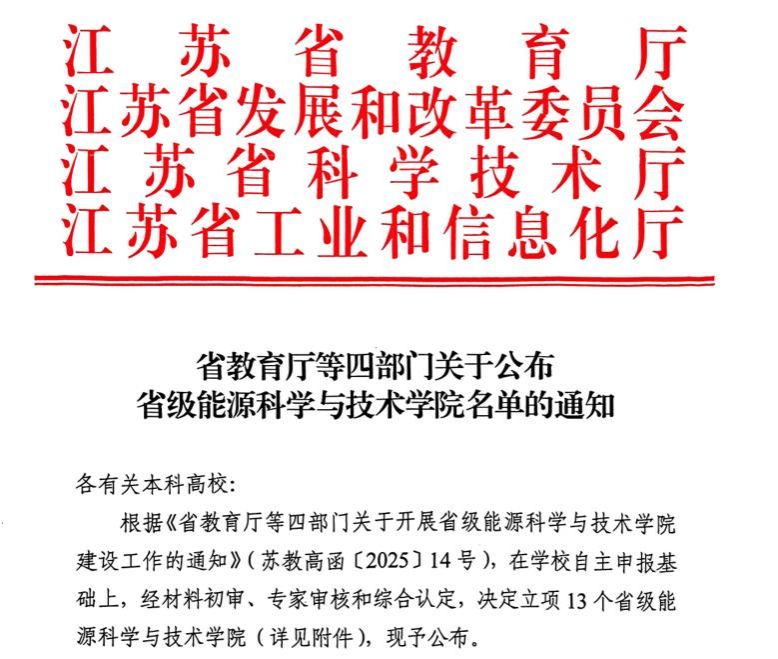 近日,江苏省教育厅、省发展和改革委员会、省科技厅、省工业和信息化厅联合公布省级能源科学与技术学院名单,真人赌博游戏_澳门赌博网-app*官网化学化工学院凭借鲜明的服务新能源产业特色成功入选,标志着真人赌博游戏_澳门赌博网-app*官网在服务国家能源安全战略、赋能江苏新型能源体系建设及制造业绿色低碳转型的进程中,迈入高质量发展新阶段。