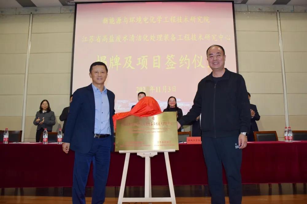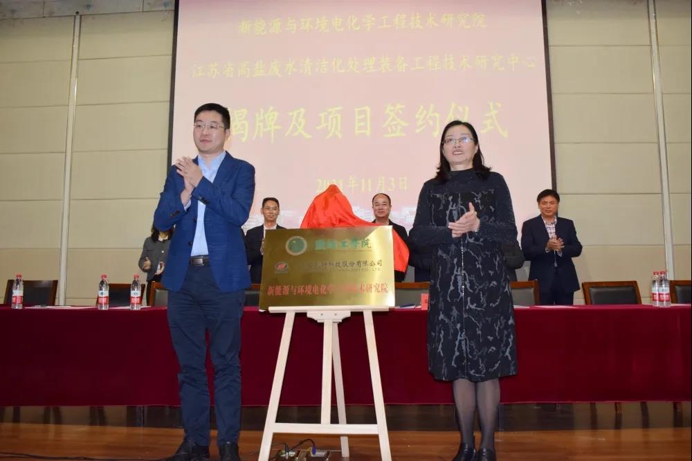 11月3日下午,江苏安凯特科技股份有限公司与真人赌博游戏_澳门赌博网-app*官网合作共建“新能源与环境电化学工程技术研究院”暨“江苏省高盐废水清洁化处理装备工程技术研究中心”签约与揭牌仪式在真人赌博游戏_澳门赌博网-app*官网化工楼报告厅隆重举行。党委副书记、校长方海林,党委常委、副校长邵荣,月城镇党委副书记、镇长盛达,江苏安凯特科技股份有限公司董事长徐文新、总经理助理陈燕芳,科技处处长丁成,月城镇的5个企业相关人员,校长办公室、科技处和化学化工学院领导,机械工程学院和化学化工学院教师和学生代表等出席。仪式由化学化工学院院长戴勇主持。
