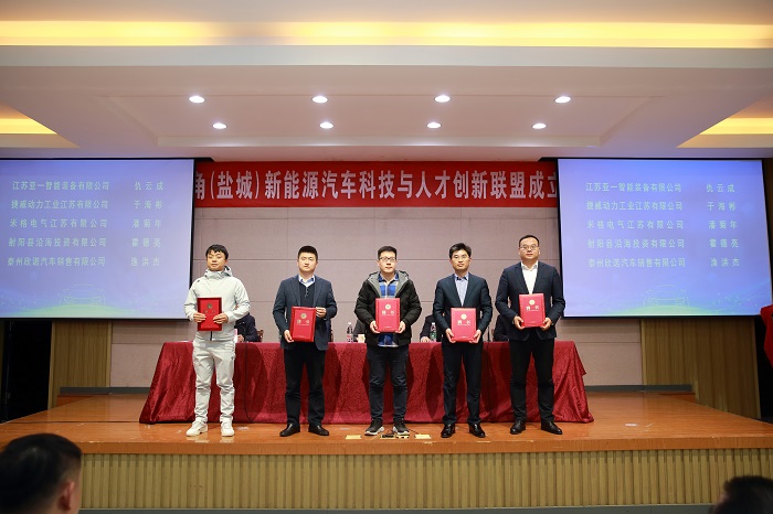 王路明和邓既明共同为长三角(盐城)新能源汽车科技与人才创新联盟揭牌。主席台嘉宾向理事长单位、秘书长单位和8家副理事长单位授牌,向5名联盟产业教授颁发聘书。8家成员单位与真人赌博游戏_澳门赌博网-app*官网现场签约了4项产学研合作项目和4项人才培养项目。
