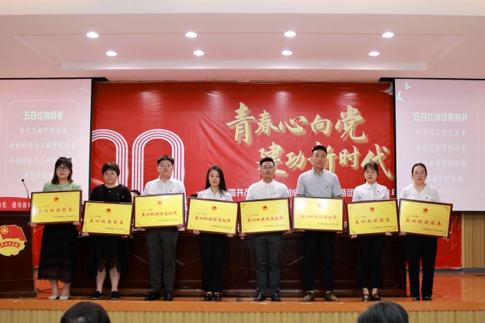 获得校“五四红旗团委标兵”、“五四红旗团委”集体上台领奖