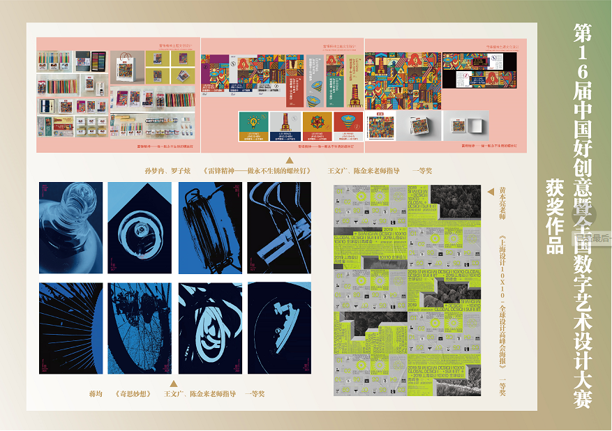 本届大赛共分为省级赛与全国赛两个赛段,经过省级选拔,设计艺术学院共有10组作品入围全国赛,并有10组作品获得省级奖项。终评环节,王文广、陈金来老师指导学生蒋鋆创作的作品《奇思妙想》,孙梦冉、罗子炫创作的作品《雷锋精神-做一颗永不生锈的螺丝钉》获得视觉传达学生组全国一等奖;黄本亮老师创作的作品《上海设计10X10-全球设计高峰会海报》获得视觉传达教师组一等奖;王瑾老师创作的作品《墨子矩阵-面向乡村产业再造的绿色智造工厂》《共享垃圾桶》等5件作品分别获得产品造型组2个二等奖、3个三等奖。这是设计艺术学院在教育部认定的57项学科竞赛中获奖规格最高、获奖作品最多的一次比赛。