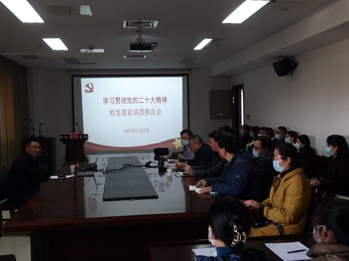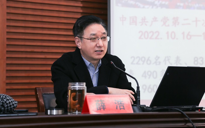 薛浩介绍了党的二十大的基本情况,从党的二十大的主题和主要成果、新时代10年的伟大变革、开辟马克思主义中国化时代化新境界的历史责任、中国式现代化的丰富内涵、全面建设社会主义现代化国家的目标任务、以党的自我革命引领伟大社会革命的重大要求、“三个务必”的谆谆教导和团结奋斗的时代要求、“两个确立”的决定性意义和实践要求等八个方面对党的二十大报告进行了系统阐释和深入解读。他强调,要把学习宣传贯彻党的二十大精神作为当前和今后一个时期的首要政治任务,要更加深刻领悟“两个确立”的决定性意义,增强“四个意识”、坚定“四个自信”、做到“两个维护”,弘扬伟大建党精神,坚持为党育人、为国育才,自觉把思想和行动统一到党的二十大精神上来,将党的二十大精神转化为推动真人赌博游戏_澳门赌博网-app*官网、学院事业高质量发展的强大动力,为建设高水平一流应用型大学努力奋斗。