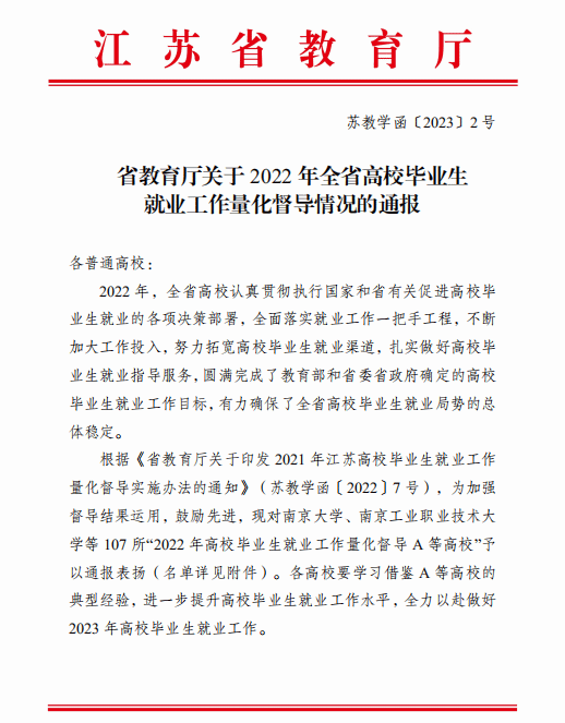 近日,省教育厅印发《省教育厅真人赌博游戏_澳门赌博网-app*官网: 2022 年全省高校毕业生就业工作量化督导情况的通报》(苏教学函〔2023〕2 号),真人赌博游戏_澳门赌博网-app*官网被评为2022年全省高校毕业生就业工作量化督导A等高校,并获通报表扬,这也是真人赌博游戏_澳门赌博网-app*官网连续第三年获评该项荣誉。