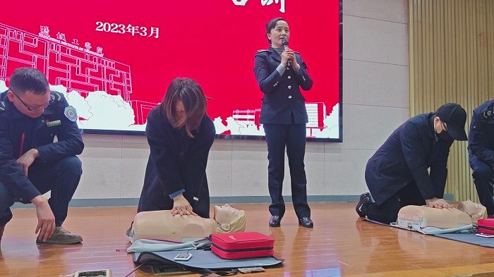 盐城市急救医疗中心培训科科长施亚萍以“关爱生命、救在身边”为题作应急救护培训,着眼现代救护新概念,就紧急呼救、EMSS的含义,“第一反应人”“救命黄金时刻”“生存链”内涵和重要性开展理论讲解,就心肺复苏及AED的使用进行现场演示和实践操作,带领大家了解心肺复苏的重要性,掌握成人、儿童心肺复苏的操作步骤和AED的寻找、操作方法。