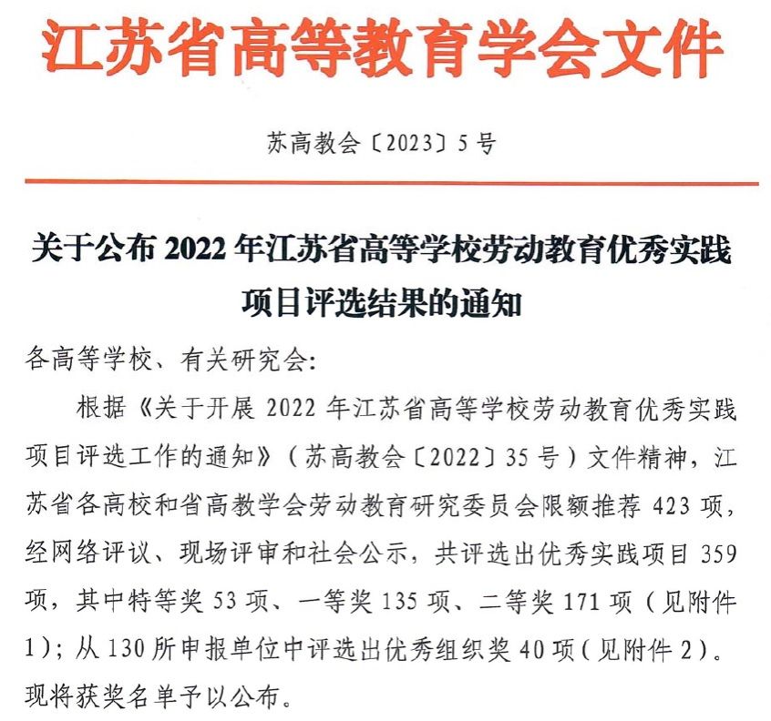 近日,江苏省高等教育学会公布了2022年江苏省高等真人赌博游戏_澳门赌博网-app*官网劳动教育优秀实践项目评选结果,真人赌博游戏_澳门赌博网-app*官网共有3个项目获奖。其中,特等奖1项,一等奖1项,二等奖1项。