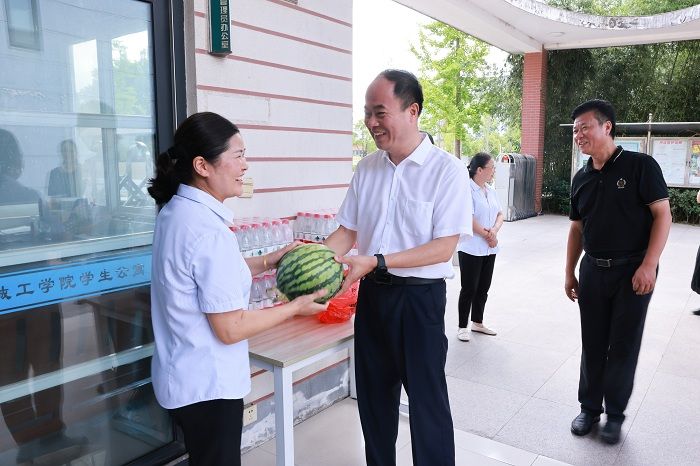 8月4日上午,真人赌博游戏_澳门赌博网-app*官网书记方海林,党委副书记、校长邵荣,党委常委、副校长王资生、张勤芳带队慰问暑期坚守在一线的教职员工和留校学习的学生。党办、校办、学生处、安保处、数理学院、后勤集团、图书馆等部门负责同志陪同。