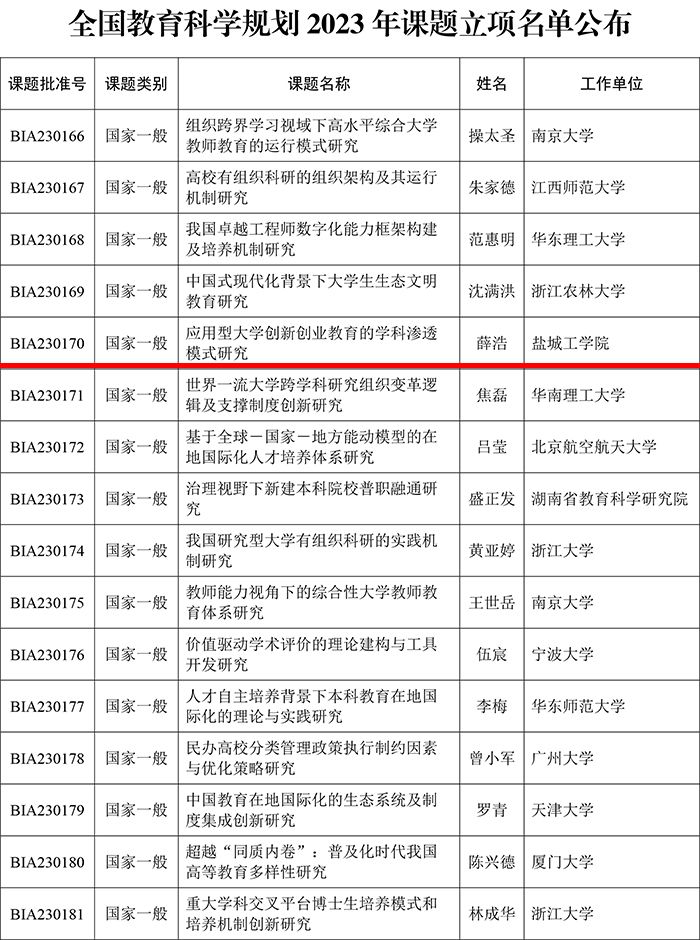 日前,全国教育科学规划领导小组办公室公布全国教育科学“十四五”规划2023年度课题立项名单,我真人赌博游戏_澳门赌博网-app*官网副书记薛浩教授的课题《应用型大学创新创业教育的学科渗透模式研究》获批国家社科基金教育学项目立项。据悉,此次全国共立项课题524项,其中国家社科基金教育学项目350项,教育部课题174项,立项课题覆盖31个省份和新疆生产建设兵团,涵盖269个单位。