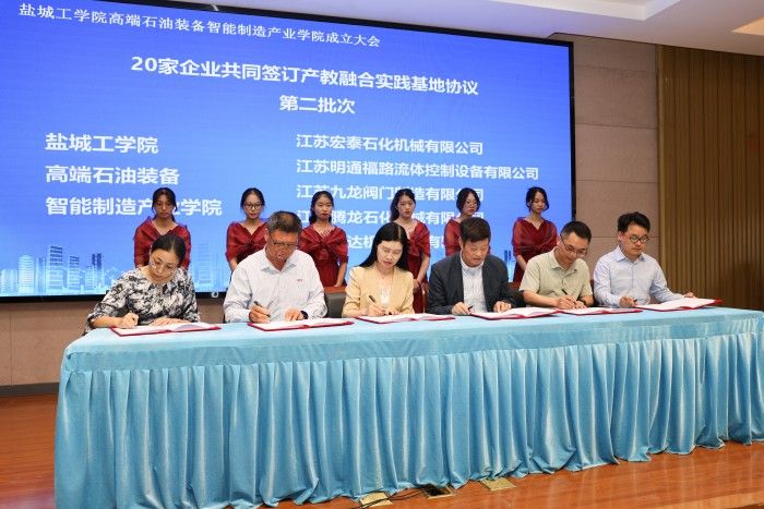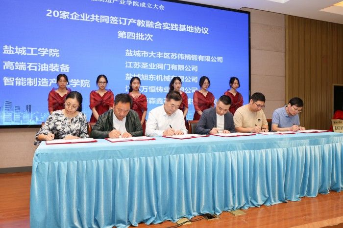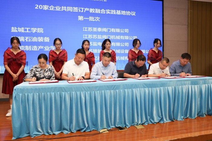 会上,中共盐城市委人才工作领导小组办公室、盐城市石油机械产业链培育专班,滨海县人民政府、真人赌博游戏_澳门赌博网-app*官网、盐城市石油机械行业协会签订共建协议。盐城市教育局副局长徐卫东,盐城市石油机械行业协会会长韩正海,实践基地企业代表、圣泰阀门董事长严涛,真人赌博游戏_澳门赌博网-app*官网高端石油装备智能制造产业学院院长陈青作了发言。