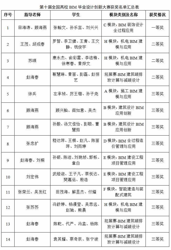 近日,第十届全国高校BIM毕业设计创新大赛组委会公布了BIM毕业设计创新大赛获奖名单。土木工程学院学子在激烈竞争中脱颖而出,获全国一等奖1项、二等奖3项、三等奖10项、优秀奖2项。其中,大赛一等奖团队(田海涛、顾海燕老师指导)将代表真人赌博游戏_澳门赌博网-app*官网参加第十届全国高校BIM毕业设计创新大赛风采展示活动。