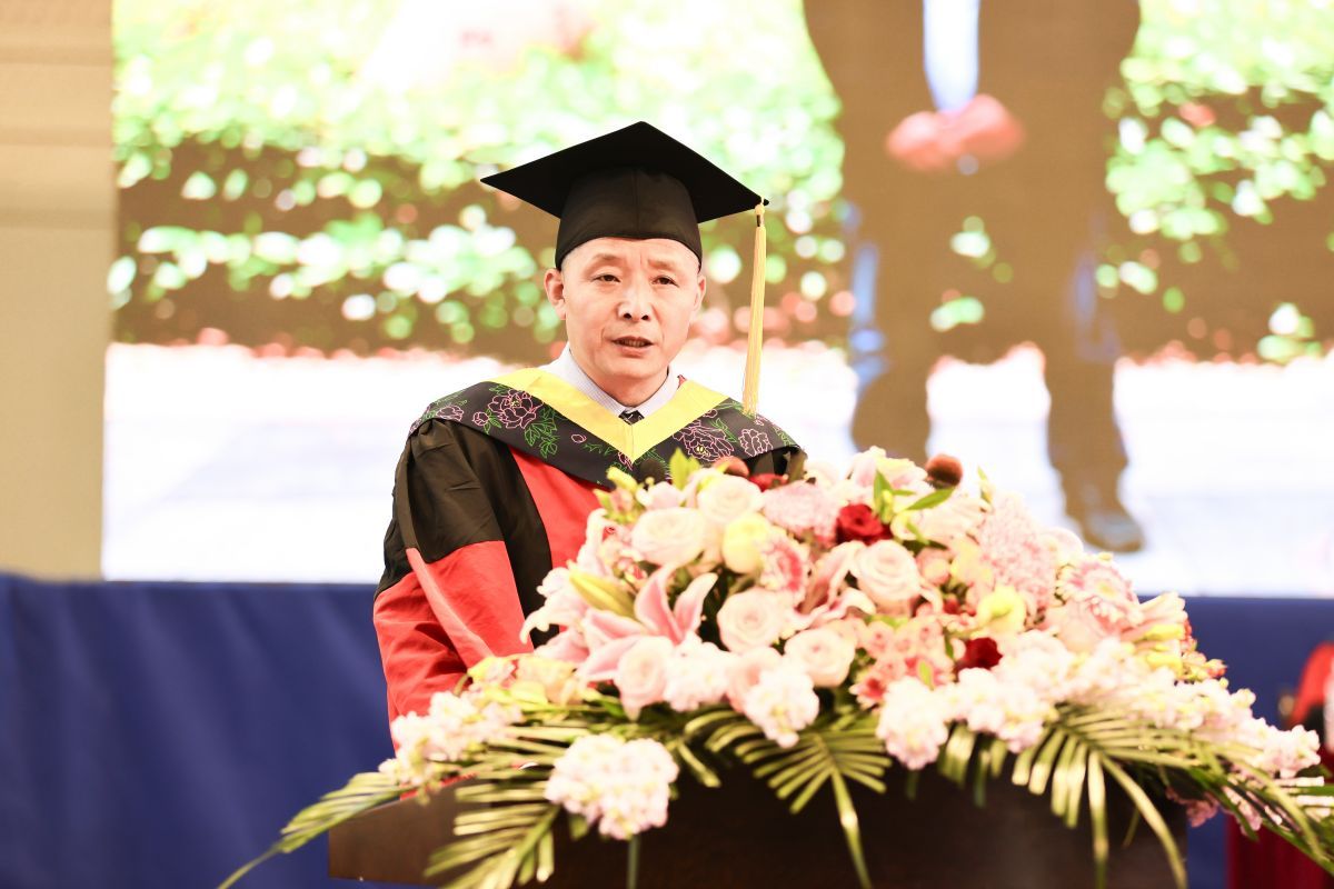 在大家即将开启人生第二次远行的重要时刻,他向每位毕业生送上殷殷嘱托,寄语同学们要崇德向上,追风逐梦,永葆少年样,带着母校“厚德格致 笃学重行”的印记,一步一个脚印往前走、攀高峰,一笔一画写人生、绘华年,让青春在敦品励学、奋发向上的拼搏中愈发生辉;要乘风万里,九天揽月,常怀青云志,胸怀家国、心系天下,以涓滴“小我”成就澎湃“大我”,让青春在为国而生、与国同行的奉献中愈发鲜亮;要坚强柔韧,履践致远,共赴繁花路,坚定“把每一项平凡工作做好就是不平凡”的恒心,保持“把每一件小事情做好就是大事业”的匠心,让青春在千磨万砺、百炼成钢中愈发闪光。