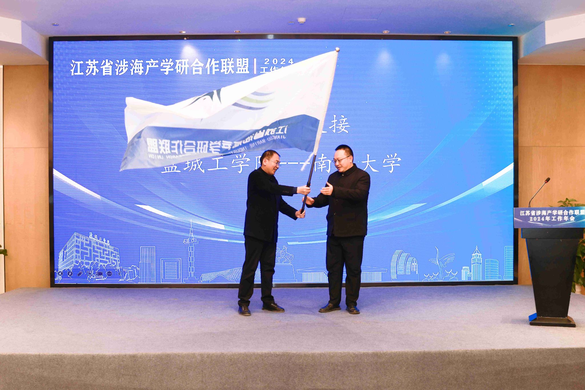 11月29日下午,江苏省涉海产学研合作联盟2024年工作年会在盐城召开。本次年会由真人赌博游戏_澳门赌博网-app*官网承办,党委副书记、校长邵荣致辞。江苏海洋大学党委副书记、校长汤建,江苏海洋大学原党委副书记、校长宁晓明,江苏省科技厅区域创新与成果转化处副处长祝永坚,江苏省自然资源厅海洋规划与经济处三级调研员刘军强,南通大学党委常委、副校长华亮,江苏科技大学党委常委、副校长周宏根,江苏海洋大学党委常委、副校长申欣,江苏省生产力促进中心科技资源开发与技术转移处副处长(主持工作)巢俊,连云港市科技局副局长李传志,盐城科技局副局长王兆军,南通市科技局党组成员、局长助理孙青山,以及真人赌博游戏_澳门赌博网-app*官网海洋与生物工程学院、大学科技园相关负责人,科学技术处的全体人员参加本次会议。