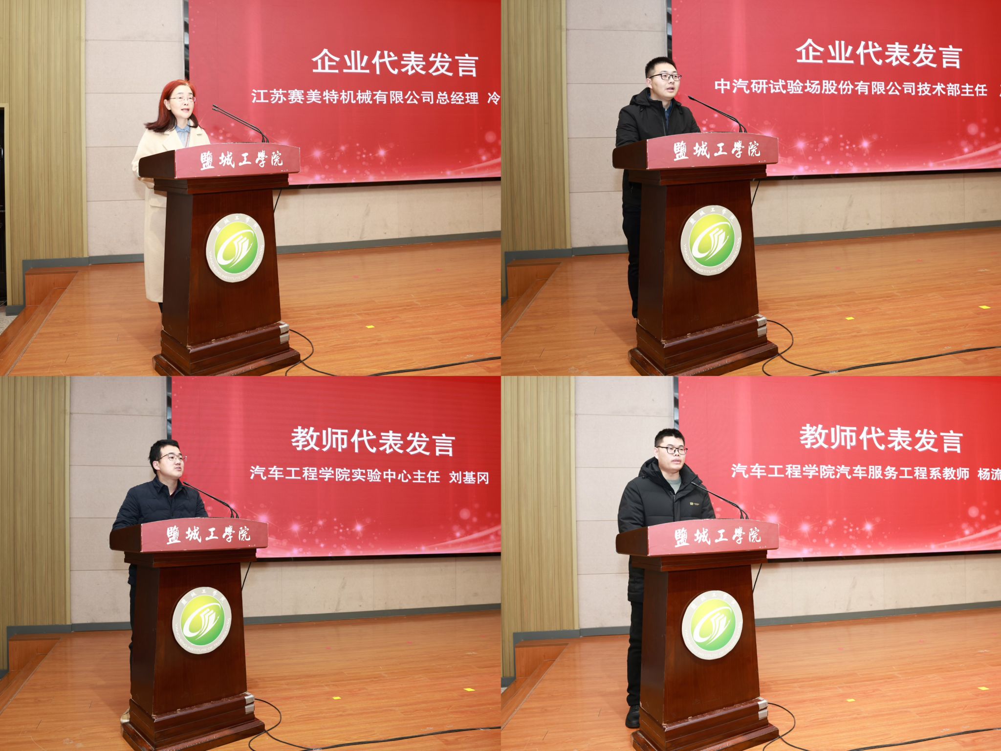 江苏赛美特机械有限公司总经理冷迎新、中汽研汽车试验场股份有限公司技术部主任严欣代表与会企业作交流发言,表示与盐城悦达新能源汽车学院的产教融合是共赢尝试,相信未来通过紧密协作,必将为行业、技术、人才培育注入更大能量。