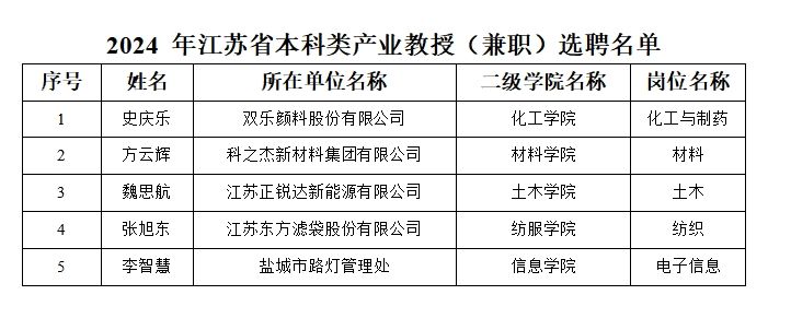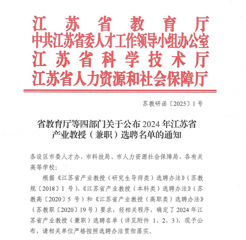 近日,省教育厅、省委人才办、省科技厅、省人力资源和社会保障厅联合发布《省教育厅等四部门真人赌博游戏_澳门赌博网-app*官网:公布2024年江苏省产业教授(兼职)选聘名单的通知》(苏教研函〔2025〕1号),本年度全省共选聘196名本科类产业教授,真人赌博游戏_澳门赌博网-app*官网推荐的候选人有5名成功获批。目前,真人赌博游戏_澳门赌博网-app*官网本科类产业教授(兼职)已达20名。