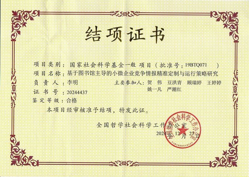 国家社科基金项目结项1项:图书馆馆长李明研究员主持的国家社科基金一般项目“基于图书馆主导的小微企业竞争情报精准定制与运行策略研究”(批准号:19BTQ071)。