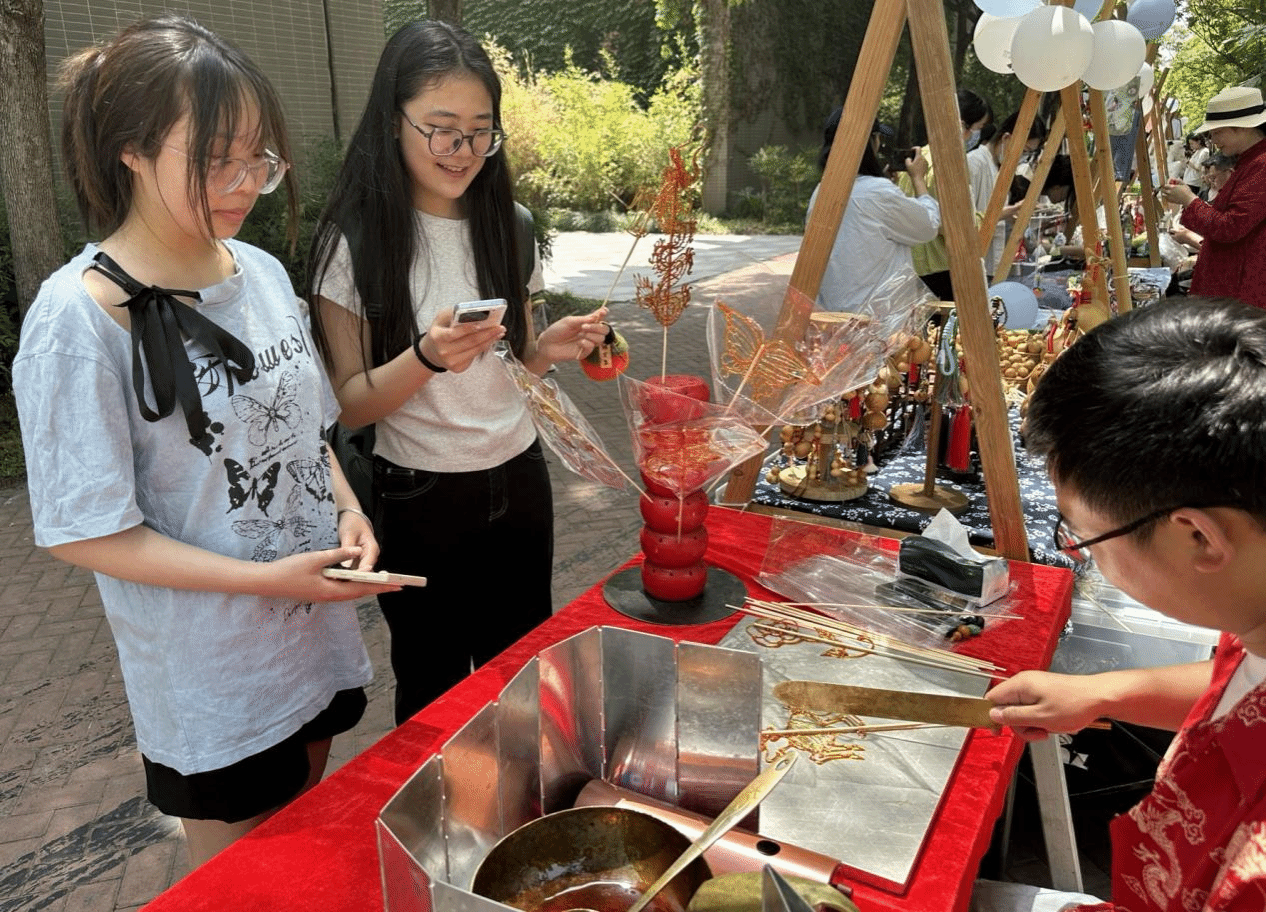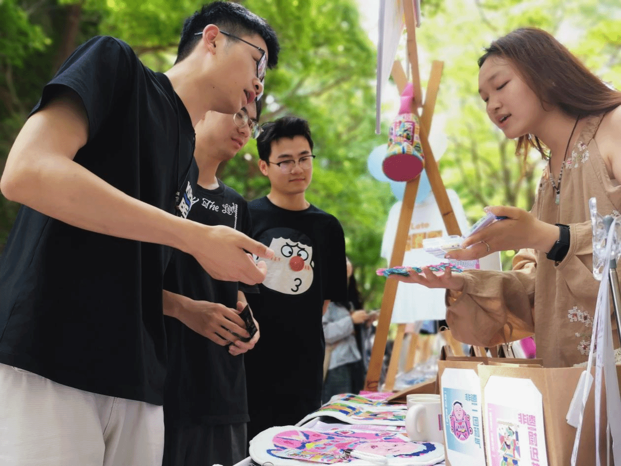 薛浩对“创意市集”这种展示形式给予了充分肯定,与前来布展的盐城非遗传承人以及学生“摊主”们进行了亲切交流,询问各类文化创意产品的设计理念、制作工艺等,鼓励同学们要敢于创新,大胆实践,不断在在创新实践中增本领、长才干。非遗传承人们制作的面塑、糖画、葫芦糖画以及同学们亲手设计制作的徽章、坠饰、布袋、T恤等琳琅满目的创意作品吸引了众多师生驻足欣赏、体验和选购。各展位前人头攒动,整个市集现场热闹非凡。同学们巧妙地将传统手工技艺与现代时尚元素相融合,创作出了一件件既具有传统文化韵味又不失现代感的精美作品,赢得了现场师生的赞许和认可。