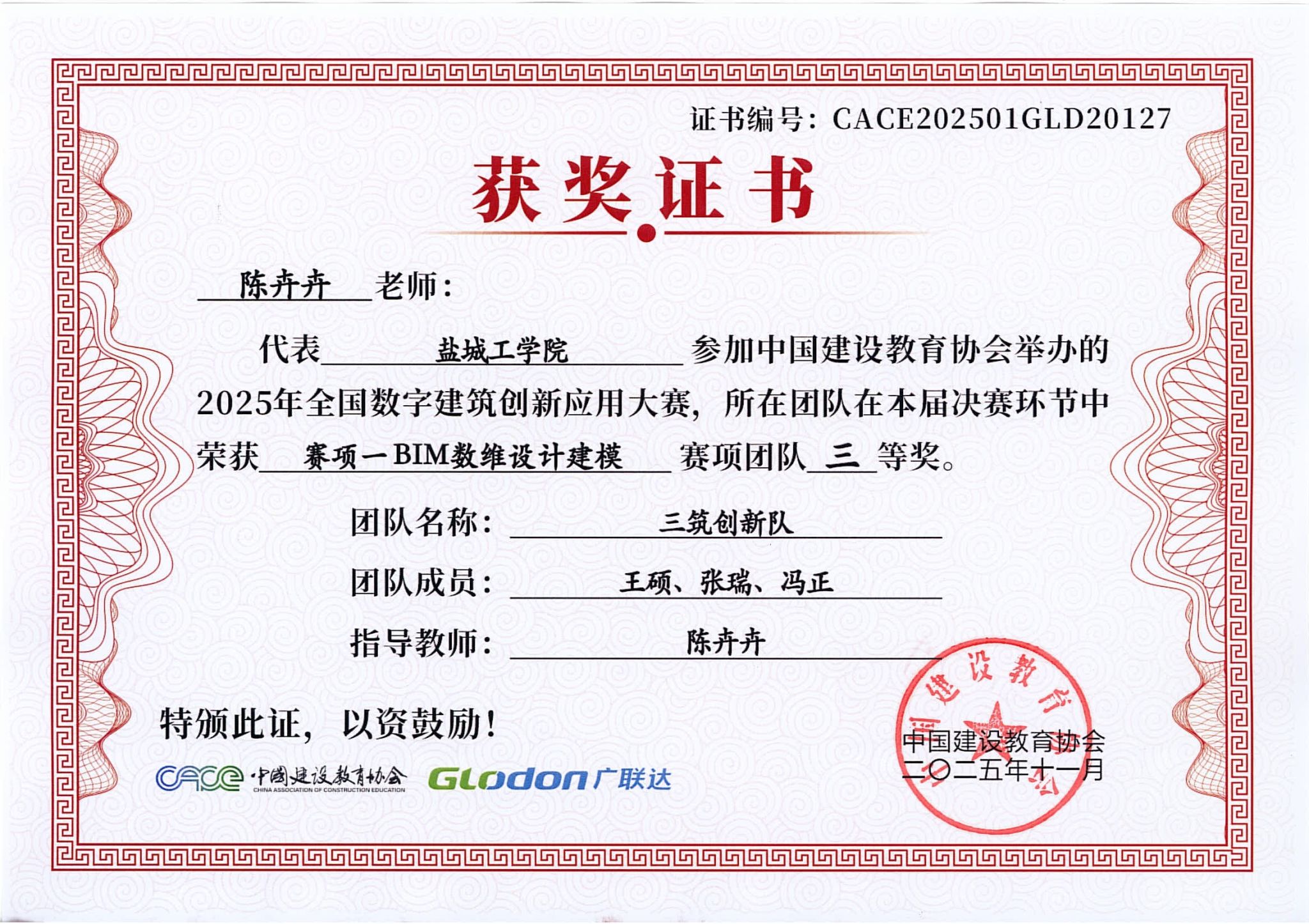 本次大赛自2025年5月启动以来,参赛队伍在学院的高度重视和指导老师的精心指导下,以扎实的专业功底、精湛的技术应用和出色的团队协作能力,充分展现土木学院学子的强劲实力与风采。此次成绩的取得,是土木学院坚持“以赛促教、以赛促学、赛教融合”育人理念的生动体现,不仅彰显了学院在数字化建筑教学改革与创新型人才培养方面的显著成效,也极大地激发了学生投身专业学习与实践创新的热情。
