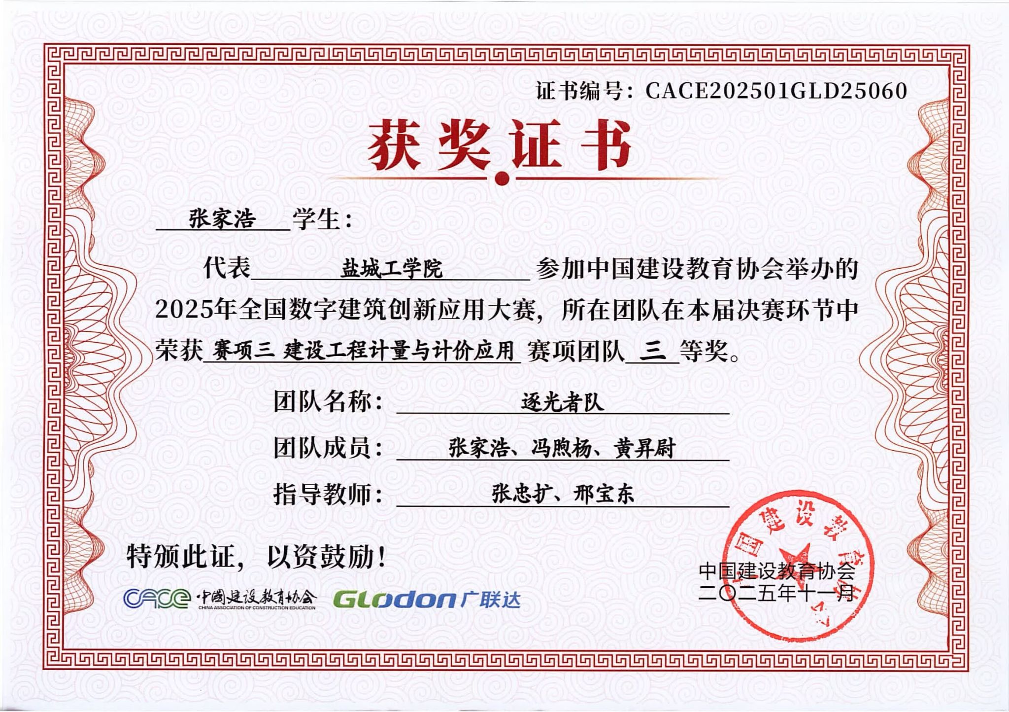 12 | 张家浩、冯煦杨、黄昇尉 | 工程管理、土木工程 | 赛项3:建设工程计量与计价应用 | 全国三等奖 |