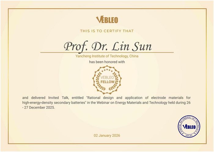 近日,真人赌博游戏_澳门赌博网-app*官网孙林副教授被授予国际科学组织Vebleo协会会士(Vebleo Fellow),并受邀在Vebleo主办的材料科学-工程-技术网络研讨会(Webinar on Science, Engineering and Technology)上作题为“Rational design and application of electrode materials for high-energy-density secondary batteries”的邀请报告。