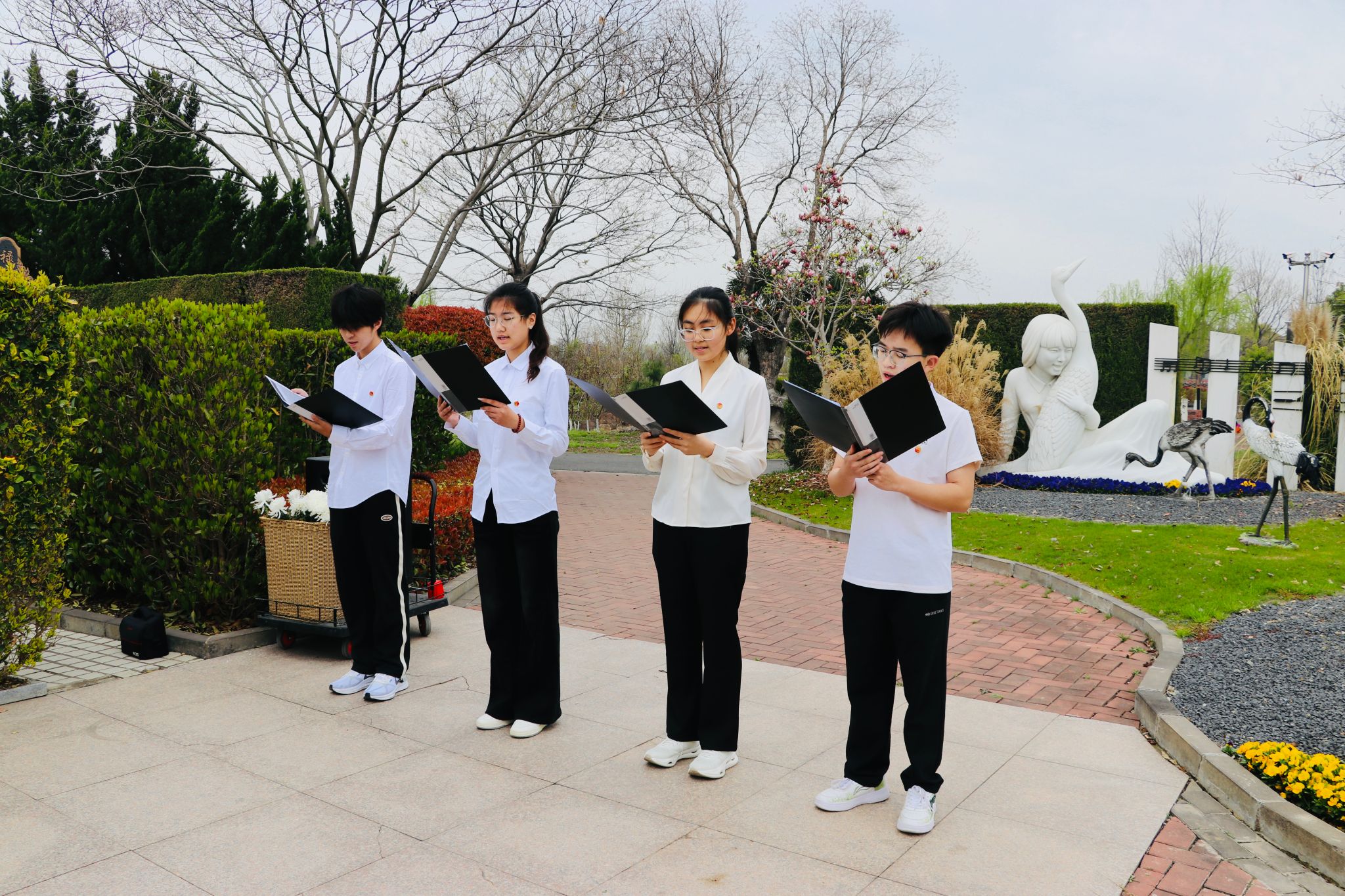 随后,全体师生面向烈士雕像肃立默哀,以此寄托对烈士的深切哀思与崇高敬意。默哀完毕,学生代表王鑫、杨晨曦、周子玉、刘彦孜深情朗诵诗歌《盐蒿》,字字铿锵、句句深情,将对烈士的追思与敬仰融入诗行,传递出新时代青年传承英烈精神的坚定决心。紧接着,全体师生高举右拳,重温湿地保护志愿者誓词,铿锵有力的誓言回荡在墓区上空,彰显着守护生态、勇担使命的责任与担当。仪式尾声,师生们依次向烈士墓敬献白黄菊花、鞠躬致意,以朴素而庄重的行动,寄寓对英烈的缅怀之情,践行着文明祭扫的理念。