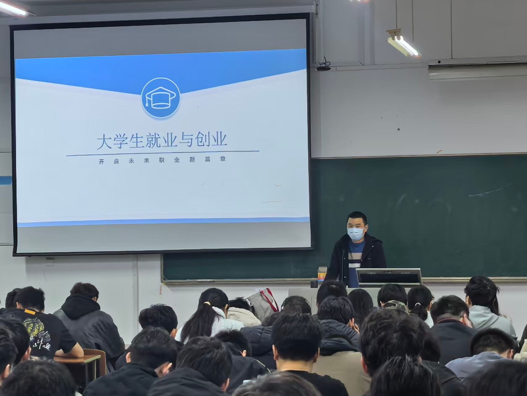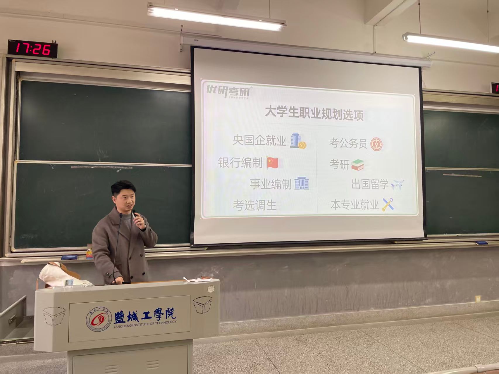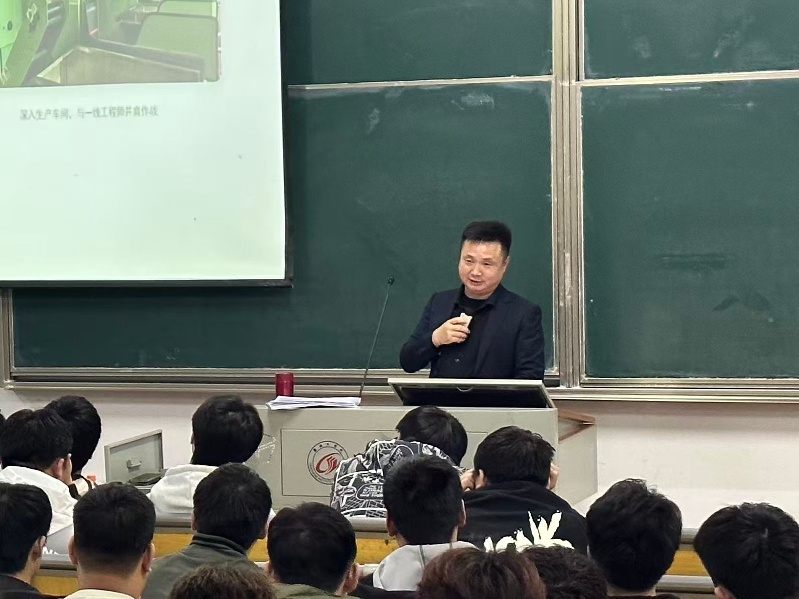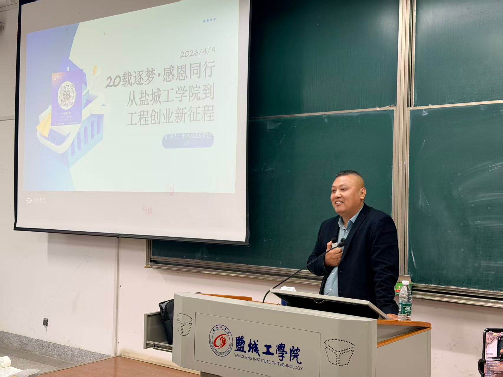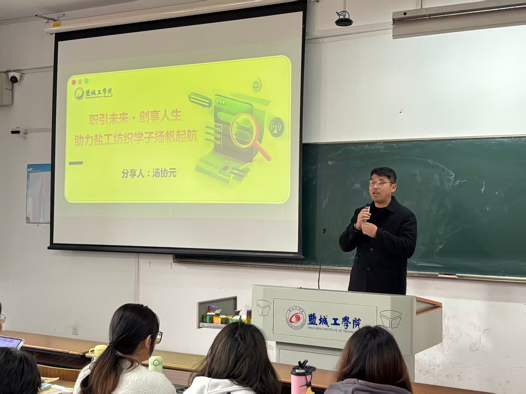 课堂上,六位校友依据自身深耕领域的丰富从业经历,围绕学生关心的职业发展路径、行业发展现状、职场能力提升等话题展开精彩分享。管理96级校友、江苏海马纺织机械有限公司董事长陆立秋,以《以实干笃定前行 以奋斗成就梦想》为题,讲述了自己从毕业一步步成长为行业领军人物的奋斗历程,鼓励大家扎根一线实践,努力成为“六有”新人;土木02级校友、江苏风雨无阻建设有限公司董事长黄建兵,以《20载逐梦 感恩同行》为题,通过自身跌宕起伏的经历诠释“事虽难,做则必成”的内涵,勉励学弟学妹们珍惜校友情谊,勇于尝试新事物,敢于坚守初心;计算机06级校友、盐城天博科技有限公司总经理董杨,以《开启未来职业新篇章》为题,全方位、多角度地展示了个人职业发展的轨迹,鼓励同学们珍惜在校时光,科学规划未来发展路径;电气09级校友汤协元以《职引未来 创享人生》为题,详细解读了江苏省及盐城市就业创业扶持政策,梳理了就业创业风险防控要点,提醒同学们在憧憬未来的同时也要保持清醒的头脑;营销12级校友、盐城黑马科技发展股份有限公司董事长卓伟文,以《盐城黑马科技:从0到行业头部的增长密码》为题,系统分享创业各阶段经验,强调创业需要不断学习与沉淀,在行动中明晰方向;环境16级校友、盐城优研考研创始人缪冬林,以《以初心,赴山海:从盐工出发》为题,将自身创业历程拆解为四个阶段,分享了从打工到创业的萌芽、试错与成长,鼓励同学们培养核心能力、做好职业规划、坚定初心信念。