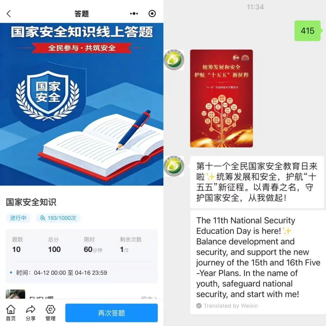 此次主题活动紧扣第11个全民国家安全教育日“统筹发展和安全,护航‘十五五’新征程”的核心内涵,以沉浸式、多元化的活动形式,引导青年学子在亲身参与中学习国家安全知识、强化安全责任意识。
