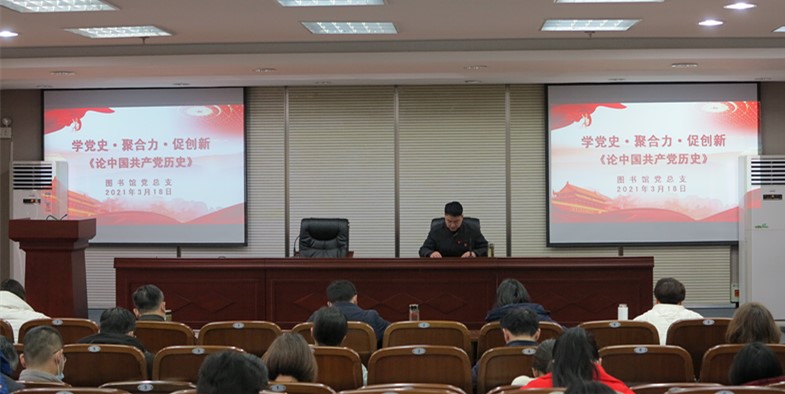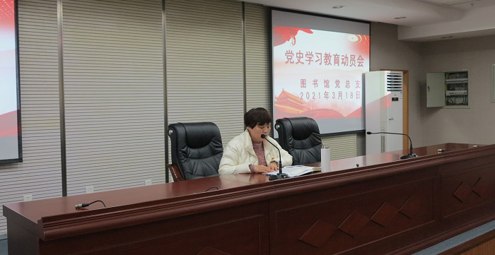 3月18日下午,在南校区图书馆5楼报告厅,图书馆召开党史学习教育动员会,党总支书记高琴主持,全体党员参加。