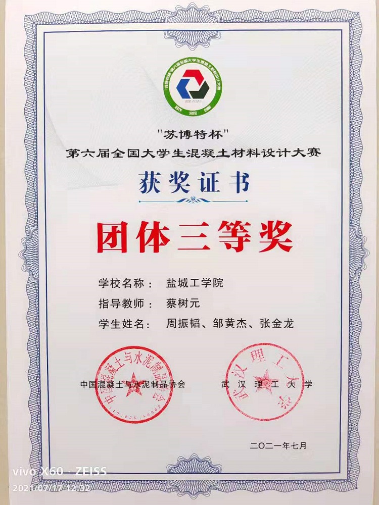 7月13日至15日,第六届全国大学生混凝土材料设计大赛在武汉理工大学举行,真人赌博游戏_澳门赌博网-app*官网材料学院2019级材料科学与工程专业学生周振韬、张金龙与邹黄杰组成的盐栗队获得团体三等奖,蔡树元老师获优秀指导教师奖。