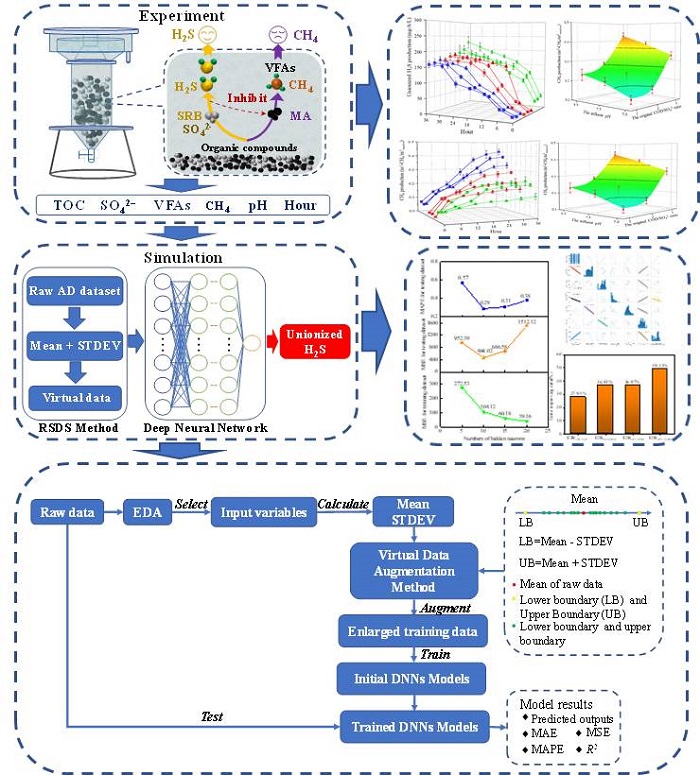 本研究采用基于拉依达准则的数据增强方法来提升深度神经网络模型对厌氧消化过程中硫化氢产生量的预测精度,探究了不同虚拟数据集及模型结构对模型拟合效果的作用规律,揭示了虚拟数据及结构对模型拟合能力的作用机制及影响规律。该方法有效的缩短了厌氧消化中非线性生化反应过程的建模周期,并提升了该模型的预测鲁棒性,可辅助厌氧消化中硫化氢毒性抑制提供实时精确预测,为人工智能辅助决策控制解决具体环境问题提供了实用性手段。