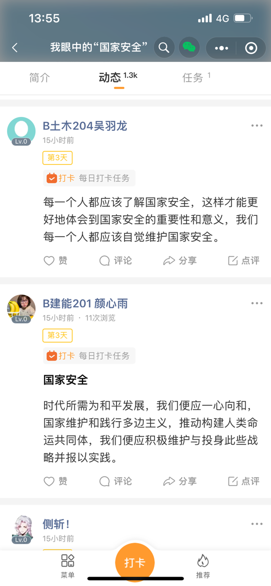 4月12日,在微信“小打卡”程序中发起“我眼中的国家安全”打卡活动,鼓励同学们畅聊心中所想、心中所悟。B土木204吴羽龙说,“每一个人都应该了解国家安全,这样才能更好地体会到国家安全的重要性和意义,我们每个人都应该自觉维护国家安全。”