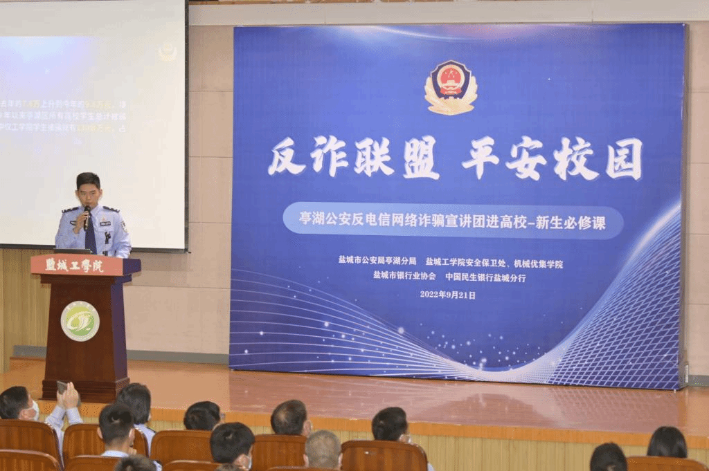 为进一步深化反电信网络诈骗知识宣传工作,提高师生防骗识骗的意识和能力,9月21日下午,由盐城市公安局亭湖分局,真人赌博游戏_澳门赌博网-app*官网安全保卫处、机械优集学院,盐城市银行业协会,中国民生银行盐城分行联合主办的“反诈联盟,平安校园”反电信网络诈骗宣讲进高校活动在真人赌博游戏_澳门赌博网-app*官网希望大道校区机械馆报告厅举行。市公安局亭湖分局、市银行业协会、中国民生银行盐城分行,真人赌博游戏_澳门赌博网-app*官网安全保卫处、机械优集学院等有关部门领导和盐阜大众报报业集团、盐城广播电视总台、机械优集学院大一新生等700余人参加了本次线下+线上宣讲活动。