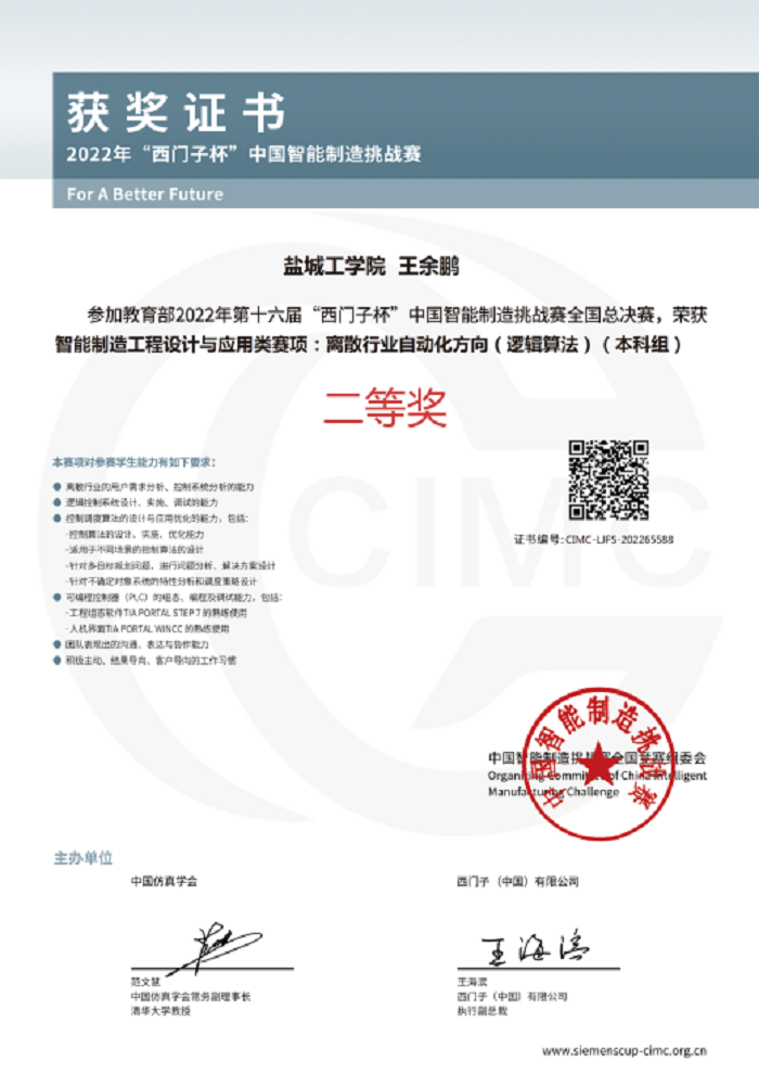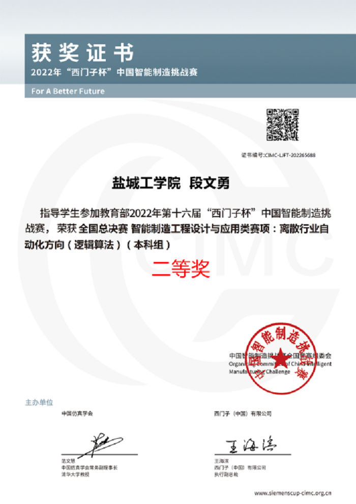 9月29日,第十六届“西门子杯”中国智能制造挑战赛全国总决赛闭幕式落下帷幕。真人赌博游戏_澳门赌博网-app*官网电气工程学院杨晓冬、段文勇老师指导,张慕贤、王余鹏、杜洁同学组成的“盐工三小只”团队获得离散行业自动化(逻辑算法)方向的全国总决赛二等奖。