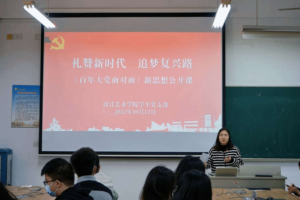 10月12日下午,设计艺术学院学生党支部在润美楼A209开展“礼赞新时代 追梦复兴路”——《百年大党面对面》新思想公开课,会议由党支部书记顾清主持,党支部组织委员叶禎菲领学,全体学生党员参加。