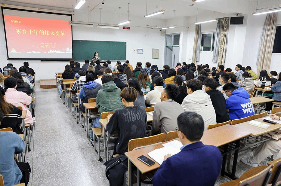 二十大胜利闭幕后,顾清带领学生共同学习了党的二十大报告,引导学生深刻理解和把握新时代十年伟大变革的深刻内涵和重大意义。学习结束后,布置了以“家乡十年的伟大变革”为题的主题研讨任务。四个班102名学生自由分组,结合自己经历和感受的家乡十年巨变,采用视频、海报、手绘图等多元艺术表现形式,走上讲台进行汇报展示,分享鲜活事例,畅谈切身感受,台下师生在“沉浸式”体验中感受祖国各地十年发生的伟大变革。