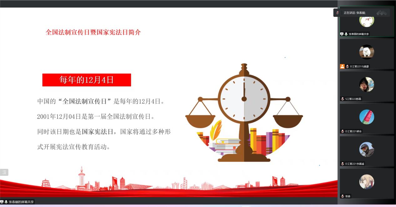 11月30日晚7点,土木工程学院通过线上腾讯会议举办了“学法用法向未来”专题讲座,辅导员张春丽主持,土木学院全体学生参加。