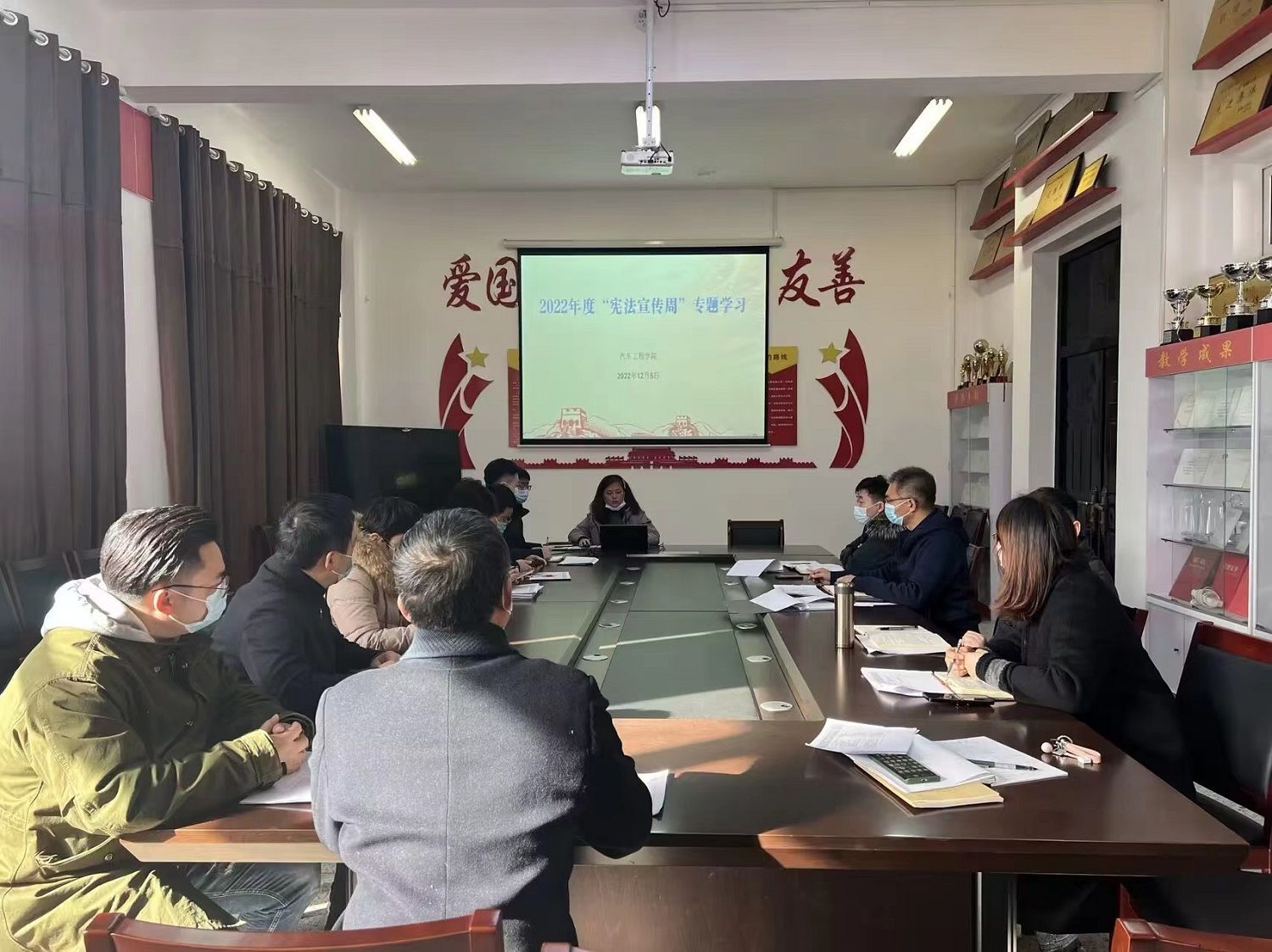 12月5日上午,汽车工程学院组织处科级干部开展“宪法宣传周”专题学习。学院党总支书记杨军强调,要把学习宣传习近平法治思想作为一项重要政治任务,用好各种传播手段,推动习近平法治思想深入人心、落地生根;大力组织开展“宪法宣传周”活动,使宪法法律走进校园、融入师生日常生活,推动全院形成宪法学习宣传的热潮。
