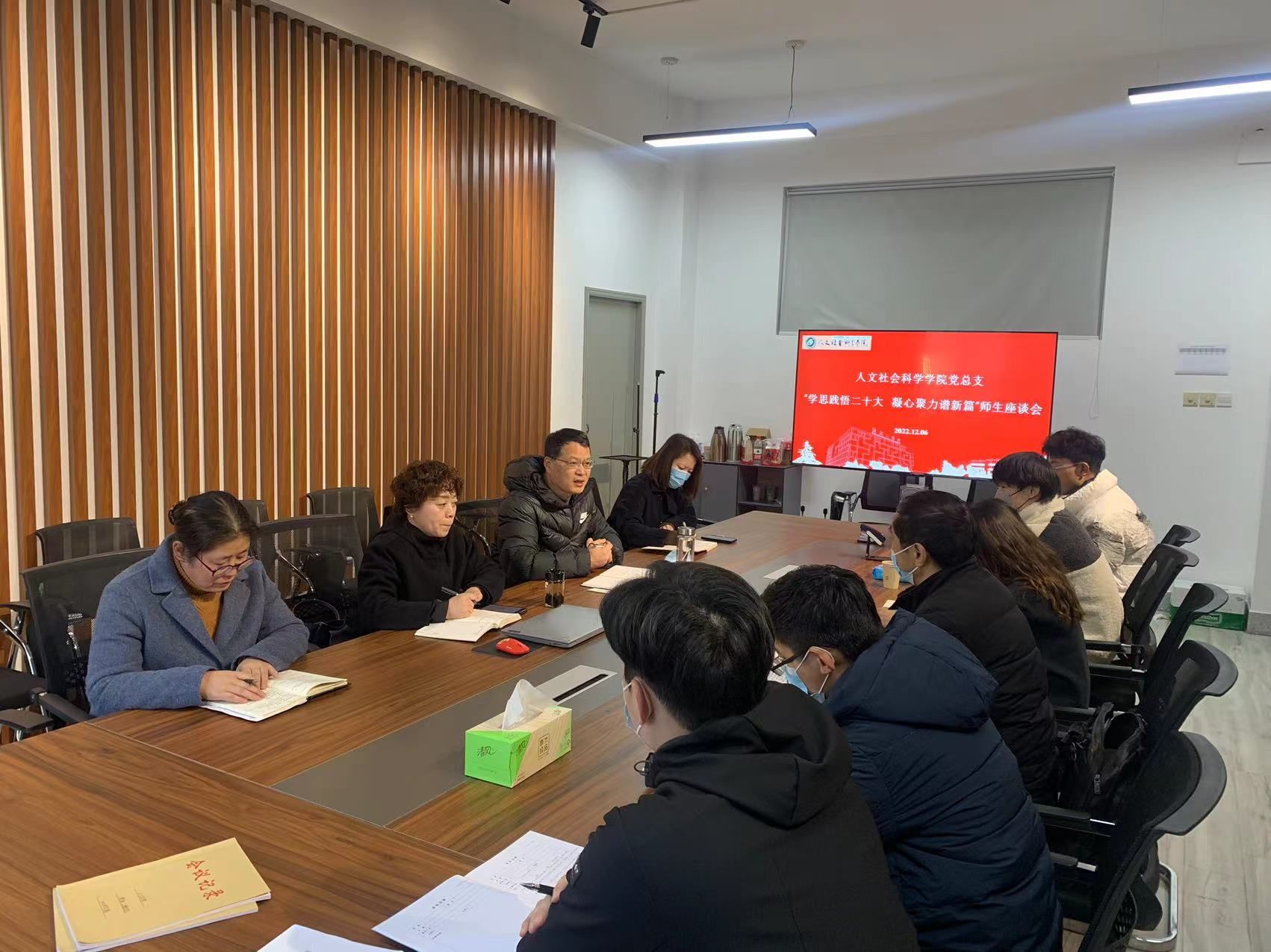 为深入学习宣传贯彻党的二十大精神,12月6日上午,在仁和楼A304会议室,人文学院党总支召开“学思践悟二十大,凝心聚力谱新篇”师生座谈会。院长周晓燕、院党总支副书记姚爱华、教工第二党支部书记张玉玮以及来自党员教师代表、民主党派教师代表、学生代表10余人参会,座谈会由学院党总支书记何登溢主持。