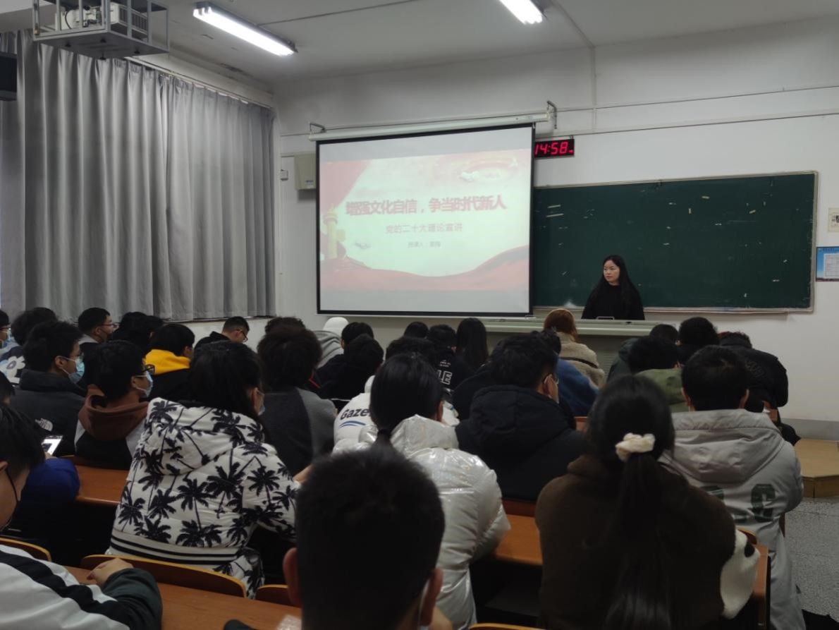 12月9日,材料学院辅导员袁梅以“增强文化自信,争当时代新人”为题,紧密结合党的二十大报告,面向2021级学生开展主题讲座。