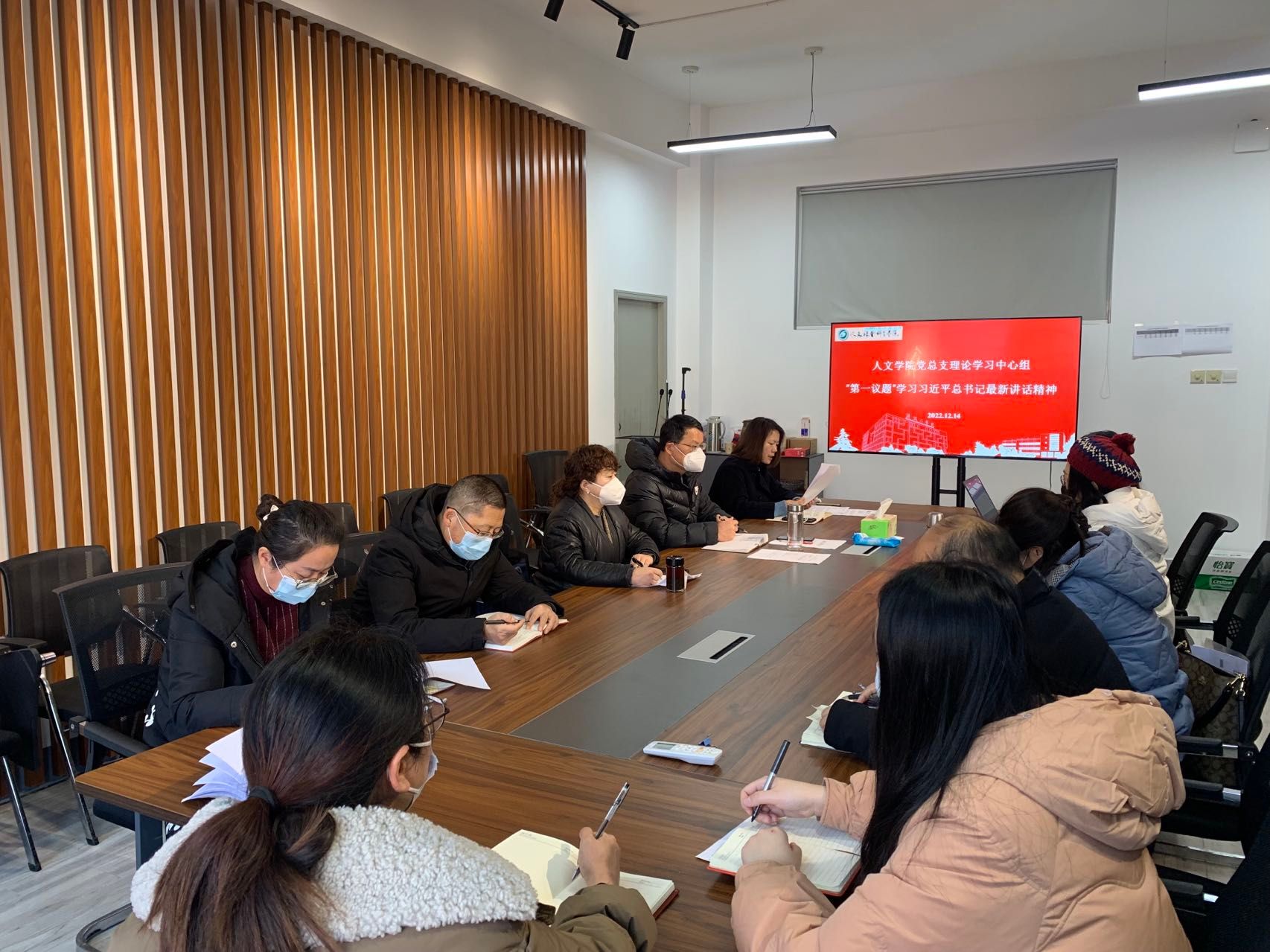12月14日上午,在仁和楼A302会议室,人文学院党总支理论学习中心组以“第一议题”形式,认真学习贯彻习近平总书记在中共中央政治局会议、党外人士座谈会上的重要讲话精神。会议由学院党总支书记何登溢主持,中心组全体成员参加。