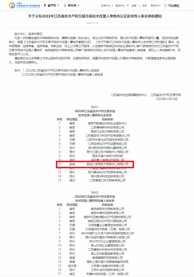 近日,江苏省科技资源统筹服务中心联合江苏省技术产权交易市场联合下发《真人赌博游戏_澳门赌博网-app*官网:公布2022年江苏省技术产权交易市场技术经理人事务所认定名单的通知》,真人赌博游戏_澳门赌博网-app*官网技术转移中心有限公司经申报推荐、资格审查、信用审查、专家咨询、网上公示等程序,被认定为“2022年度江苏省技术产权交易市场技术经理人事务所”。