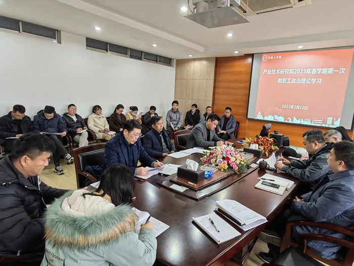 2月22日下午,产业技术研究院在北校区知达楼AE209会议室组织开展2023年春学期第一次教职工政治理论学习,重点学习《习近平总书记在学习贯彻党的二十大精神研讨班开班式上的重要讲话精神》《习近平总书记在二十届中央纪委二次全会上的重要讲话精神》《中华人民共和国劳动法》《中华人民共和国劳动合同法》和《中华人民共和国社会保险法》。党总支书记、院长严金龙主持会议,研究院全体教职工参加。