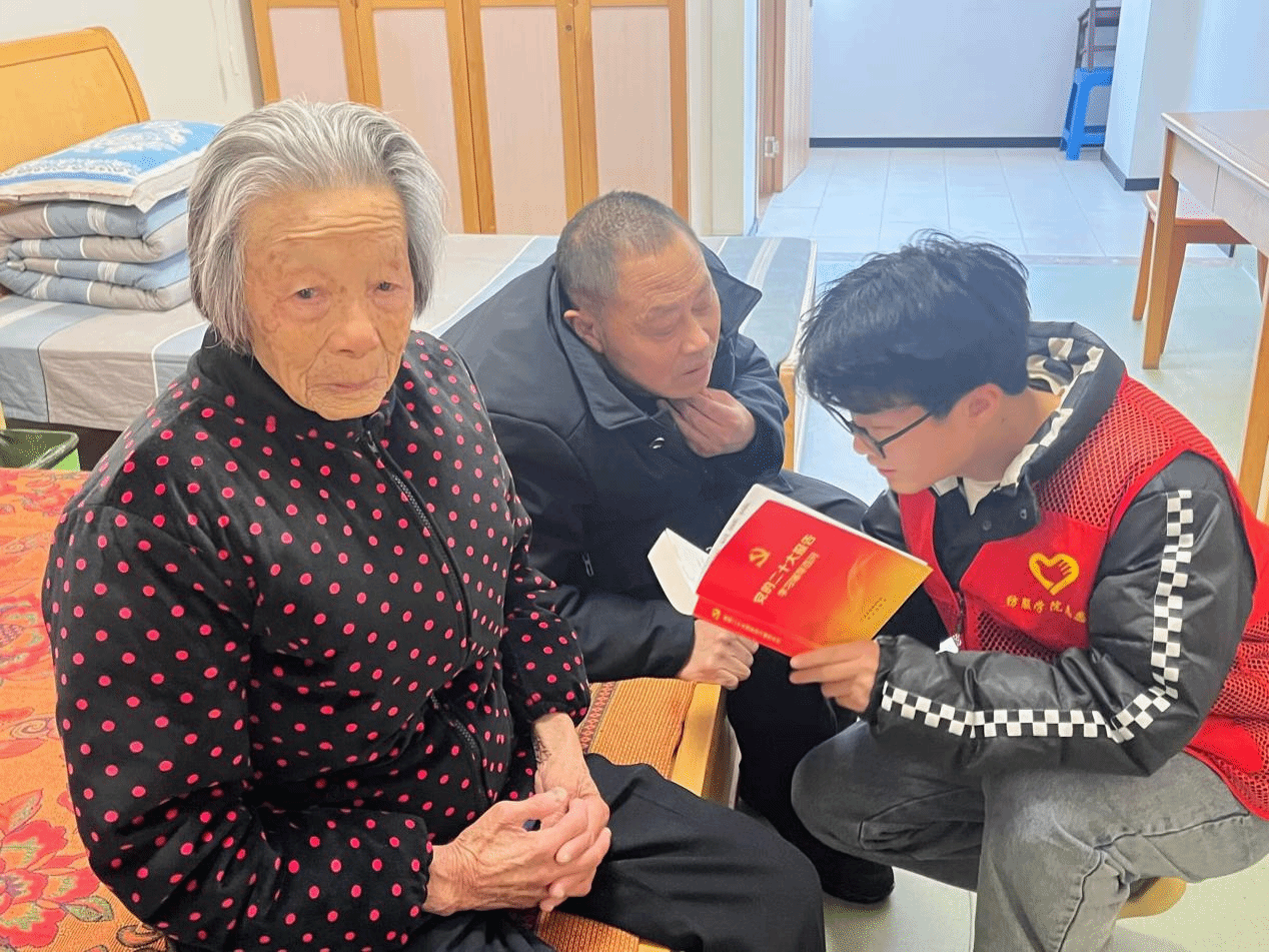 “为全面建设社会主义现代化国家、全面推进中华民族伟大复兴而团结奋斗!”纺服学子大声地朗读着党的二十大报告内容,爷爷奶奶们慢慢围了过来仔细地聆听着。在宣讲结束后,志愿者们与爷爷奶奶亲近交流,拉拉家常,用心聆听老人们的诉说,关心他们的身体健康,给爷爷奶奶的内心送上了十足的温暖和依靠。