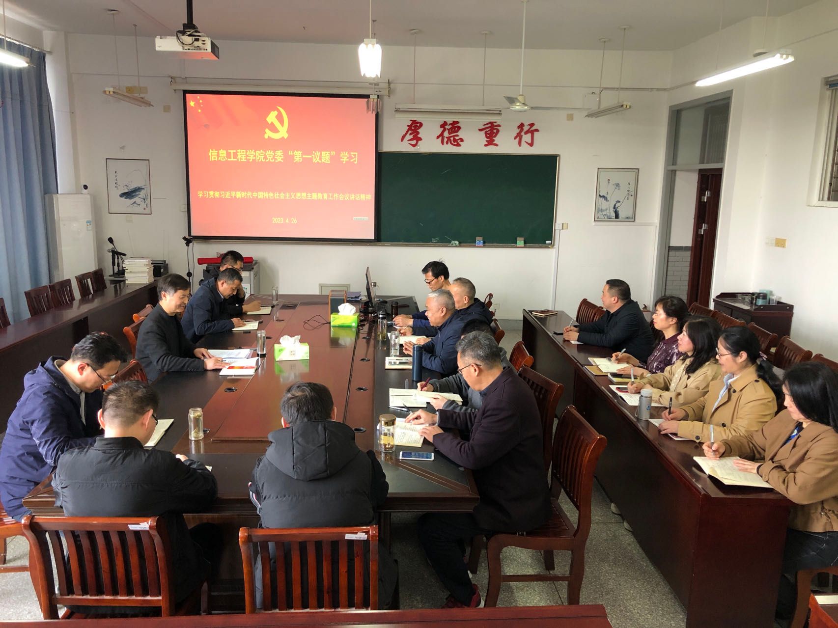 4月26日下午,在希望大道校区怀德楼B410会议室,信息学院党委会以“第一议题”形式,学习习近平总书记在学习贯彻习近平新时代中国特色社会主义思想主题教育工作会议上的重要讲话精神。学院党委书记王爱军主持会议,学院党委全体委员参加,理论学习中心组成员列席。