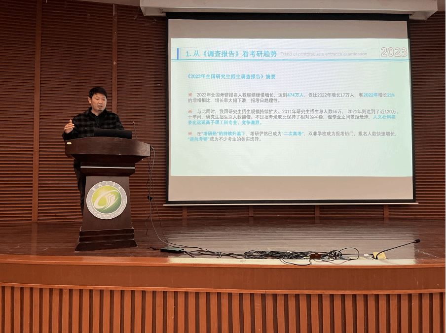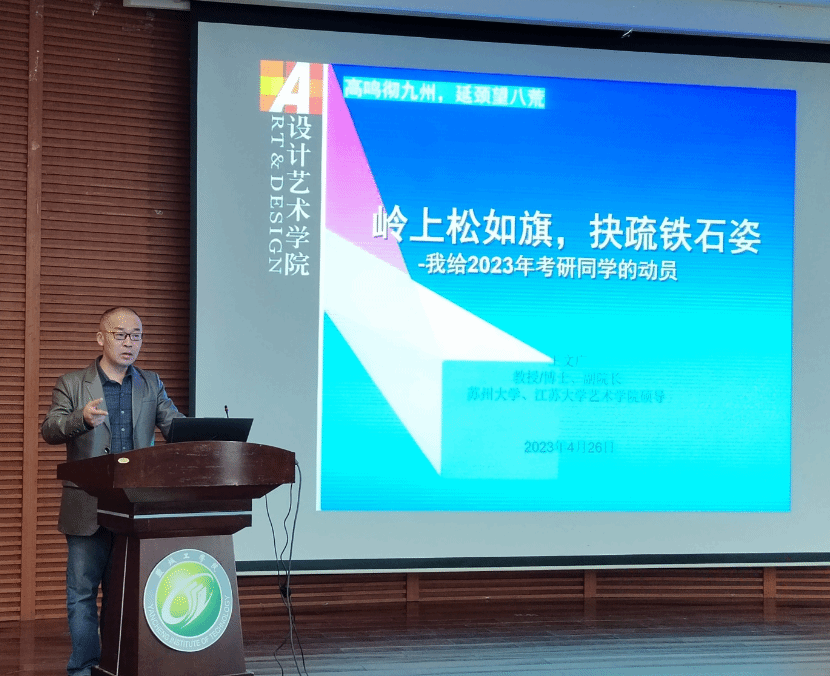 随后,王文广作题为《岭上松如旗,抉疏铁石姿》的考研动员讲话。他从为何考研、如何看考研专业课、如何择校、如何统筹时间等四方面对考研学生予以指导。他强调,考研不能只是一味刷题,要与老师、朋辈多交流,开阔专业视野,提高学习效率。他鼓励学生要坚定目标信念,耐住寂寞,克服困难,坚持到底。钱峰以《设计专业考研趋势分析》为题作考研动员指导。他从《2023全国研究生招生调查报告》的数据入手,全面分析了近几年考研趋势变化,重点就考研目的及心态、专业型硕士和学术型硕士的区别、艺术设计类的考研类型等方面进行详细阐释。他结合学院近年成功上岸的毕业生典型案例,建议学生结合自身情况理性定位,选择适合自己的院校和专业,并有计划、有步骤地推进复习。