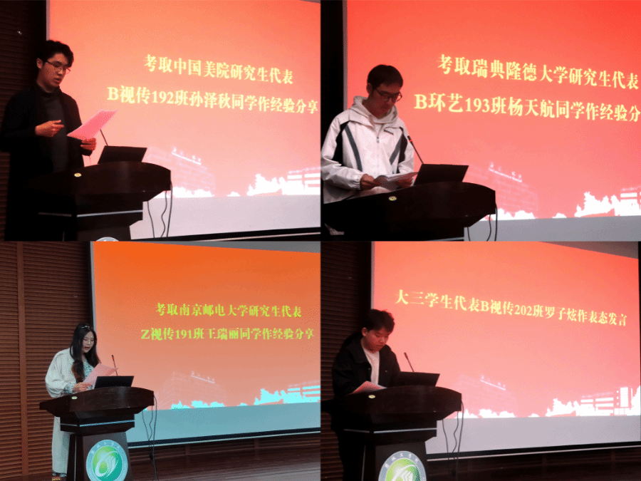 在考研经验交流环节,2023届考取国内外研究生学生代表B视传192班孙泽秋、Z视传191班王瑞丽、B环艺193班杨天航结合各自实际,从院校选择、备考技巧、心态调整等方面向参会人员分享了各自的备考历程和宝贵经验,建议同学们脚踏实地、打好基础、戒骄戒躁、坚持到底。2024届考研学生代表B视传202班罗子炫作表态发言,倡议有考研意向的同学及早规划,养成良好的学习和生活习惯,为心中的梦想不懈努力。