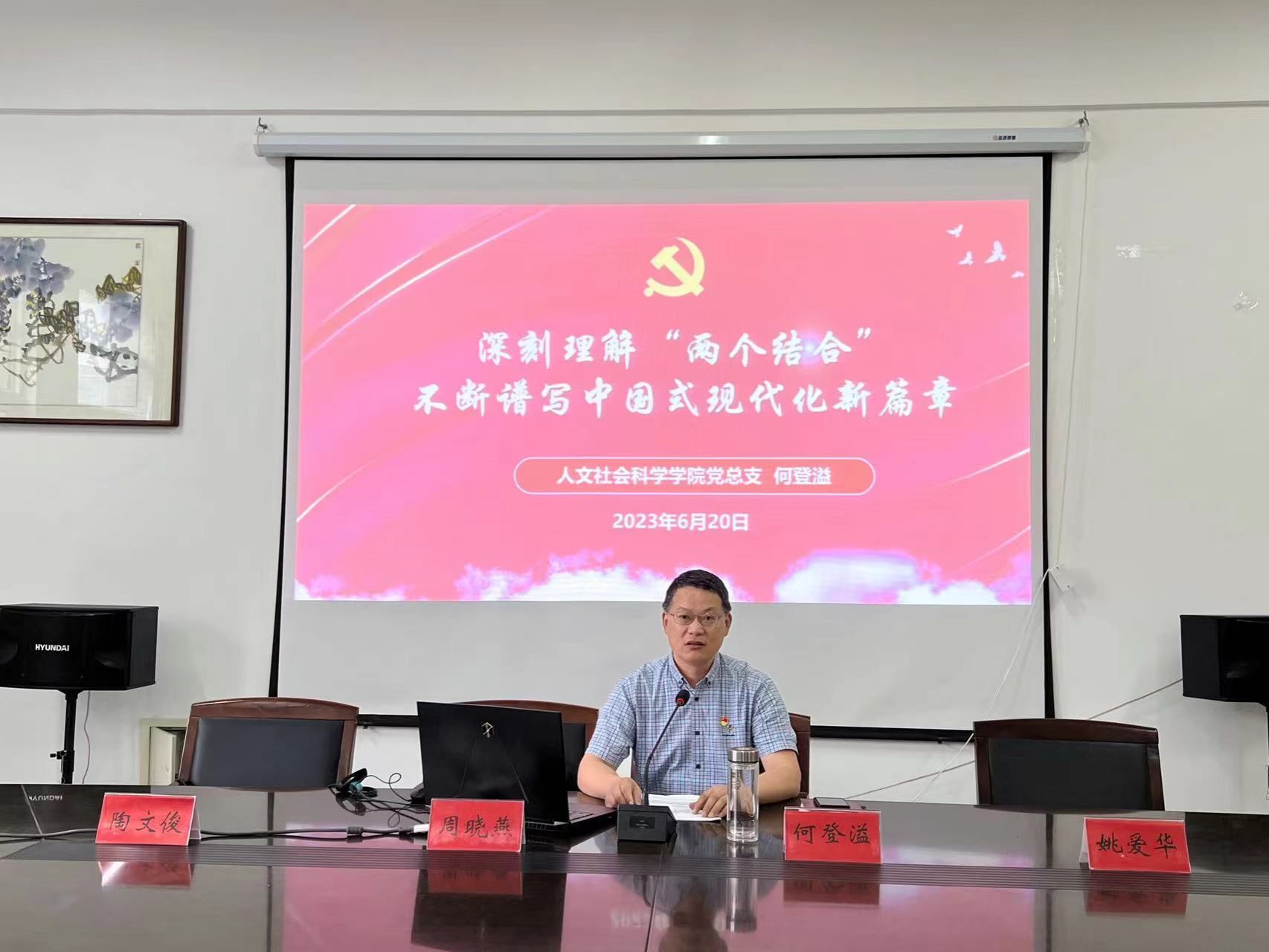 6月20日上午,在南校区仁和楼A304会议室,人文学院开展主题教育专题党课。学院党总支书记何登溢以“深刻理解‘两个结合’不断谱写中国式现代化新篇章”为题主讲,全体教职工参加。