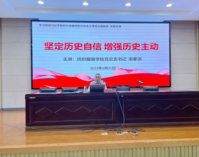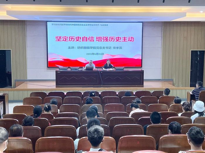 为深入开展学习贯彻习近平新时代中国特色社会主义思想主题教育,6月21日上午,在南校区机械馆报告厅,纺织服装学院党总支书记宋孝浜以《坚定历史自信 增强历史主动》为题讲授专题党课。院长王春霞主持,学院全体教职工和部分学生党员参加党课学习。
